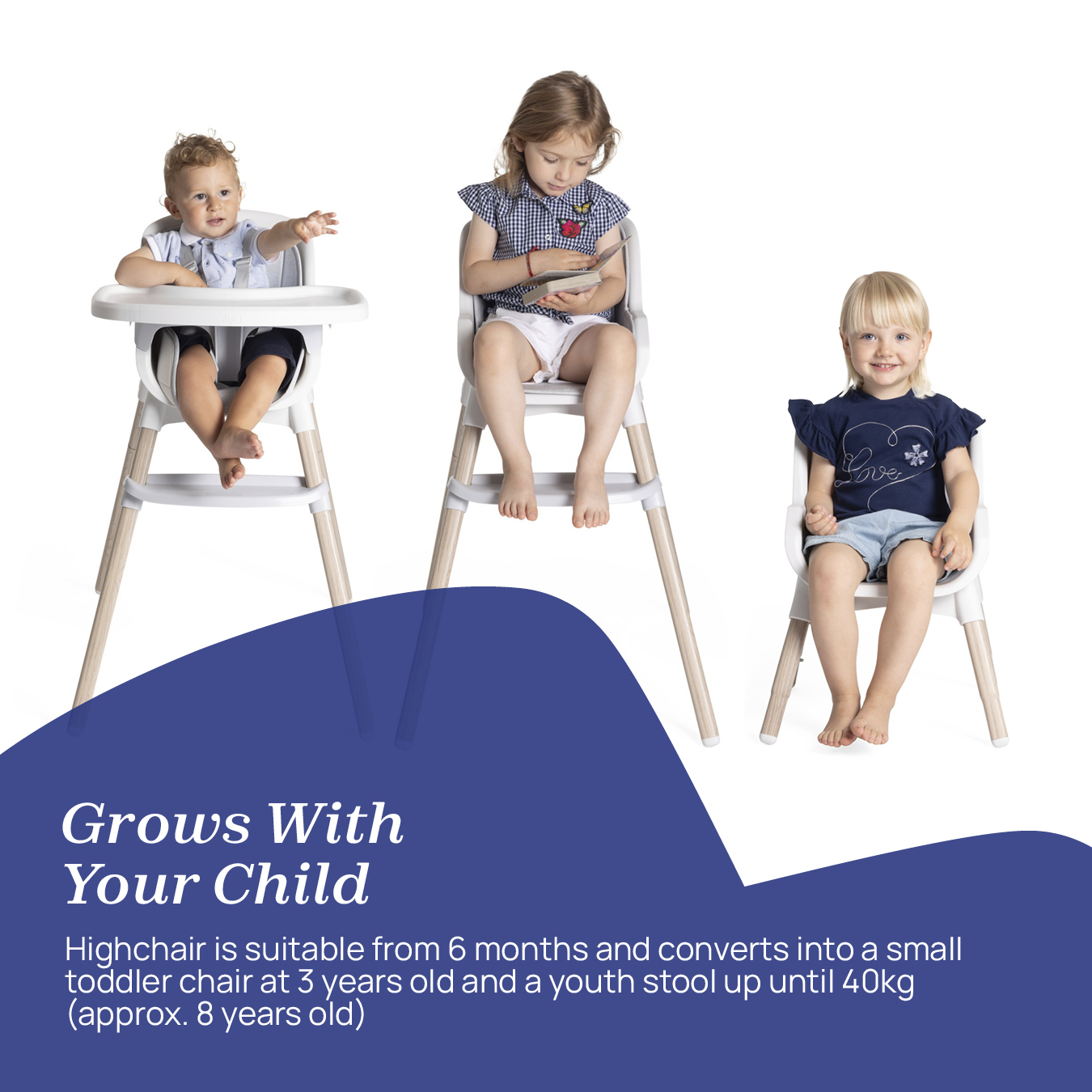 This 3-in-1 Chicco Zest Plus Highchair is the chair that grows with your child. Featuring 3 different modes, it turns into a folding highchair suitable from 6 months, easily converts into a small toddler chair at 3 years old and then a youth stool up until 40kg (approx. 8 years old).