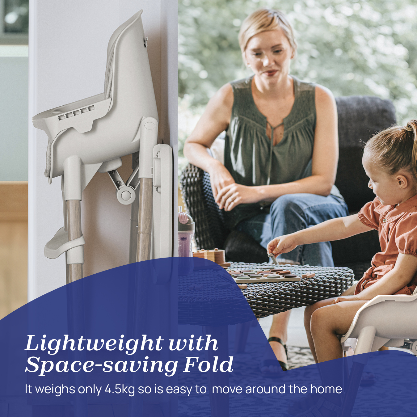 Ultra-light, the multi-functional highchair is easy to move around the home, weighing only 4.5kg. When not in use, the highchair neatly folds away to a compact size, complete with space-saving tray storage on the rear of the legs.